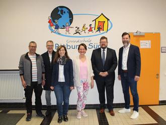 (v.l.n.r.): Hausmeister Wolfgang Kinnen, Leiter des Bauamts Berthold Steffes, Energiemanagerin Christina Schmitt, Schulleiterin Uta Schorn, Bürgermeister der Stadt Bitburg Joachim Kandels sowie Westenergie-Kommunalmanager Christian Nathem