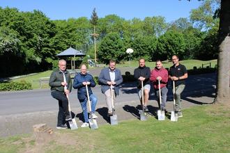 Symbolischer Spatenstich in Masholder (v.l.n.r.): Ratsmitglied Manfred Böttel, Ortsvorsteher Thomas Kröffges, Bürgermeister Joachim Kandels, Christian Peters und ein weiterer Vertreter der beauftragten Fa. Wadle, Ralf Baustert vom Stadtbauamt.