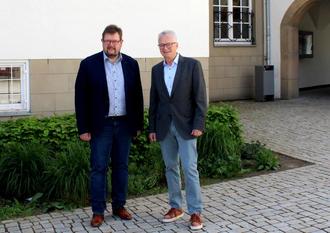 Bürgermeister Joachim Kandel und Wilfried Wülferath (re.) auf dem Rathausplatz.