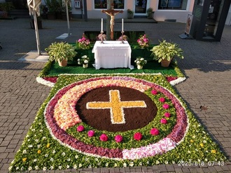 Zur Fronleichnamsprozession 2023 haben die Damen der Frauengemeinschaft Stahl einen Altar auf dem Petersplatz hergerichtet. Dort stand die 1914 abgerissene Peterskirche, weshalb die Prozession hier in jedem Jahr Station macht.