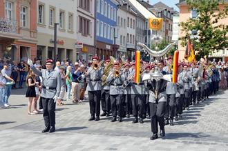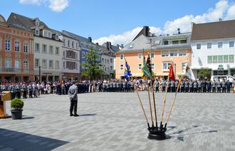 Als die Rekruten des Informationstechnikbataillons 281, Gerolstein, sowie des Informationstechnikbataillons 292, Dillingen an der Donau, dann um 15:00 Uhr auf dem Spittel aufmarschierten, bereiteten ihnen die zahlreich erschienenen „Zivilisten“ einen herzlichen Empfang. Bürgermeister Joachim Kandels begrüßte die Soldatinnen und Soldaten sowie wie alle Zuschauer. Kandels zog einen Vergleich zu seiner eigenen Zeit als Wehrpflichtiger mit der heutigen Situation, in der alle freiwillig ihren Dienst antreten. Oberst Thorsten Niemann hielt die Gelöbnisansprache. Niemann lobte den Einsatz der Bundeswehr bei Krisenherden in aller Welt und machte deutlich, wie wichtig die Armee gerade in der aktuellen Lage für unser Land ist. Er dankte den jungen Soldatinnen und Soldaten für ihren Mut, sich für die Bundeswehr zu verpflichten und wünschte eine lehrreiche und interessante Dienstzeit bei der Bundeswehr. Zuvor hatte er gemeinsam mit dem Kommandeur, Oberstleutnant Sascha Günther, und Bürgermeister Joachim Kandels die Front abgeschritten. Dann sprachen die Rekrutinnen und Rekruten den Treue-Eid.