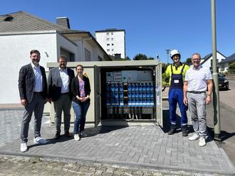 Wie das Stromnetz smarter wird, verdeutlich der Verteilnetzbetreiber Westnetz durch die Errichtung intelligenter Ortsnetzstationen wie hier in Bitburg. Das Foto zeigt (v. l.): Westenergie-Kommunalmanager Christian Nathem, Bürgermeister Joachim Kandels, Energiemanagerin Christina Schmitt, Westnetz-Mitarbeiter Michael Peter Schneider sowie Geschäftsbereichsleiter Berthold Steffes.