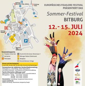 Sommerfestival: Die Stadt Bitburg lädt ein zum 58. Europäischen Folklore-Festival vom 12. bis 15. Juli 2024. Auch in diesem Jahr präsentiert Bitburg sein sommerliches Spektakel als internationales Festival mit Musik, Tanz und Klamauk auf dem Spittel, dem Petersplatz und am Grünen See sowie dem Vergnügungspark auf dem Bedaplatz.