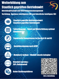 Ab dem kommenden Schuljahr startet die neue Fachschule für Betriebswirtschaft und Unternehmensmanagement mit dem Schwerpunkt Business Intelligence und Künstliche Intelligenz (BI & KI) – ein kostenloser After-Work-Weiterbildungskurs zum/zur staatlich geprüften Betriebswirt/in.