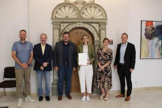(v.l.n.r. Florian Haus, Teamleiter 2.1, Friedbert Mayer, Personalratsvorsitzender, Bürgermeister Joachim Kandels, Julia Reuter, Stadtinspektorin, Melanie Enders, Geschäftsbereichsleiterin und Büroleiter Thomas Mayers