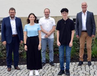 Im Bild v.l.n.r.: Bürgermeister Joachim Kandels, Stella Neumann, PR-Vorsitzender Friedbert Mayer, Leon Billen und Büroleiter Paul Treuke.