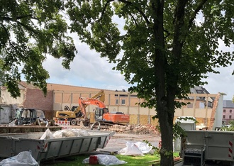 Nach den alten Toiletten ist nun auch die Turnhalle der Grundschule Bitburg-Süd fast niedergelegt. Die ausführende Baufirma hat die Arbeiten zügig begonnen und bisher reibungslos durchgeführt. Deswegen ist die Einmündung des Kirchweges vom Borenweg aus für sämtlichen Straßenverkehr noch einige Tage gesperrt. Bis zum 1. September 2023 sollen die Niederlegungsarbeiten abgeschlossen werden.