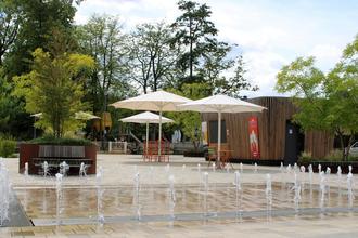 Vorplatz des Maximiner Wäldchens mit Springbrunnen und Kiosk