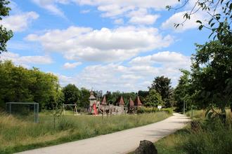 Im Grüngürtel Schleifmühle befindet sich ein Abenteuerland für Kinder im Ritterstil, mit Schaukeln, Klettergerüst, Tischtennisplatte, Seilbahn und Bänken. Die Wege bieten sich ebenfalls für einen Spaziergang mit Kinderwagen sehr gut an. Aufgrund der schönen Wiesen rundum des fantasievollen Spielplatzes, lohnt sich ein Picknick für die ganze Familie zugleich mit.