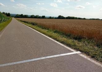 Mit einem Edelstahl-Band ist der 50. Breitengrad auf einem Feldweg oberhalb von Matzen markiert.