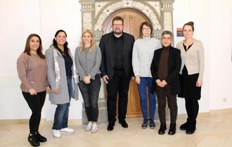 Der neue Beirat (v.l.n.r.): Shireen Warda, Fatima Chouaib, Sarah Schabo, Bürgermeister Joachim Kandels, Viktoriya Becker, Soussan Evers-Khazaeli, Inna Starikova