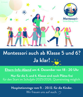 Eltern-Info-Abend: Am 4. Dezember von 18 - 20 Uhr können interessierte Eltern sich vor Ort über die Montessori-Schule, den Unterricht und die Montessori-Pädagogik informieren und ihre Fragen besprechen. Weitere Informationen folgen nach Anmeldung.