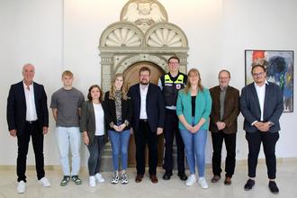 v.l.n.r.: Büroleiter Paul Treuke, Timo Schaal, Natalja Wiebe, Eve High, Bürgermeister Joachim Kandels, Maik Roderich, Paula Vollmer, Friedbert Mayer und Dennis Stein.