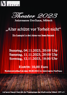 Auch in diesem Jahr lädt die Theatergruppe des Musikvereins Mötsch 1927 e.V. herzlich zu ihren Theatervorstellungen am 04.11., 11.11. und 12.11. im Jedermanns Dorfhaus in Mötsch ein.