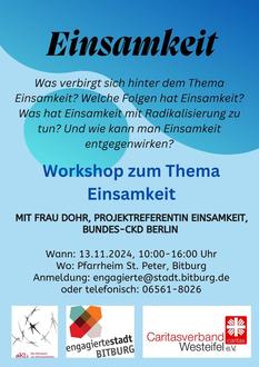In der gegenwärtigen Zeit ist das Thema Einsamkeit im öffentlichen Diskurs präsent. Der Begriff wird vielfach verwendet, doch was unter diesem zu verstehen ist, lädt bereits zum Innehalten sowie zum Austausch hierüber ein. Mit dem Forschungsstand zum Thema Einsamkeit, mit Zusammenhängen von Einsamkeit, Alter und Demokratiegefährdung sowie mit Ideen wie man gegen Einsamkeit angeht, beschäftigt sich am Mittwoch, dem 13.11.2024 ein ganztägiger Workshop von 10.00 bis 16.00 Uhr im Pfarrheim St. Peter Bitburg. Der Workshop wird als gemeinsame Veranstaltung der Elisabeth-Konferenz (CKD) Bitburg, der Engagierten Stadt Bitburg und dem Caritasverband Westeifel e.V. Bitburg (Referat Gemeindecaritas) kostenfrei angeboten. Für das leibliche Wohl wird gesorgt. Es sind noch einige wenige Plätze frei.