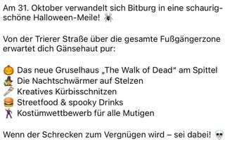 Am Freitag, dem 31. Oktober 2025, haben wieder alle Geschäfte der Innenstadt länger geöffnet, es gibt Halloween-Punsch, Glühwein, Geistergebäck, und Vieles mehr. Es wird Auftritte des Walk-Acts mit brandneuen Kostümen geben, die erstmals in Bitburg zu sehen sind. Und auch die Grusel-Figuren vom „Haunted House“ in Bitburg sind wieder dabei.