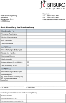 Bitte beachten Sie, dass nach der Hundesteuersatzung der Stadt Bitburg alle Hunde innerhalb von 14 Tagen, nachdem diese in den Haushalt aufgenommen wurden, bei dem Steueramt der Stadt Bitburg anzumelden sind.