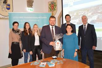 Bürgermeister Joachim Kandels (Mitte) und Jana Schmidt, Vertriebsmitarbeiterin von "Little Bird" (2.v.r.) schalten in Anwesenheit der zuständigen städtischen Mitarbeiterinnen und Mitarbeitern das neue Online-Portal frei.