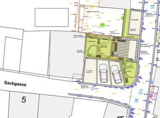 Die Brachfläche im Einmündungsbereich „Sackgasse“ und „Im Graben“ soll als multifunktionaler Platz mit klimaökologischer Gestaltung neu strukturiert werden. Hier soll ein schattiger Sitzplatz mit Pergola entstehen, der den Anliegern und Besuchern der Innenstadt zur Verfügung steht. Mit einer Infotafel wird über die Ergebnisse des Sanierungsgebiets „Altstadt“ informiert. Mit mehrstämmigen Bäumen, Sträuchern und einer 60 qm großen Staudenfläche wirkt sich der Bereich hitzereduzierend aus. Die vier neuen Anwohner-Stellplätze verbessern die dortige Parkplatzsituation. Die Stellplätze und der Sitzplatz werden mit einer wassergebundener Wegedecke ausgeführt. So wird von diesem Bereich auch zukünftig kein Niederschlag in die Kanalisation abgeführt werden.