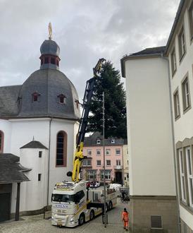 Der Weihnachtsbaum 2024 wird am Rathausplatz angeliefert.