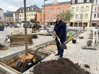 Bürgermeister Joachim Kandels hat einen symbolischen Spatenstich zur Pflanzung dreier zusätzlicher Bäume an der Poststraße auf dem Spittel vollzogen. Damit kommt die Stadt dem Wunsch nach mehr Bäumen auf diesem zentralen Platz nach. Kandels: „Ich hoffe, dass diese drei Ulmen sich prächtig entwickeln, Schatten spenden und einen Beitrag zum Klimaschutz leisten!“