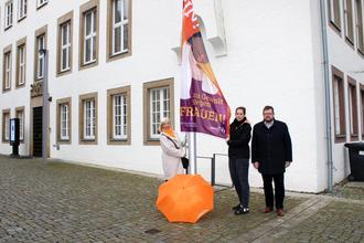 V.l.n.r.: Beate Tömmes, Julia Becker und Bürgermeister Joachim Kandels hissten das Banner am Rathaus.
