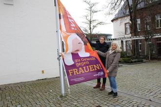 Gleichstellungsbeauftragte der Stadt Bitburg Beate Tömmes und Gleichstellungsbeauftragte der Stadtverwaltung Bitburg hissten die Fahne am 25.11.