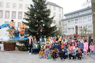 Für den großen Weihnachtsbaum auf dem Grünen See unterhalb des Rathauses hatten in diesem Jahr die Kinder der KiTa Altes Gymnasium und KiTa Zuckerborn sowie Kinder der Afa mit ihren Erzieherinnen Baumschmuck gebastelt.