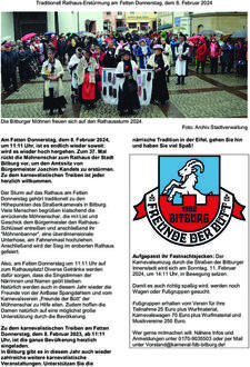 Zu dem karnevalistischen Treiben am Fetten Donnerstag, dem 8. Februar 2024, ab 11:11 Uhr, ist die ganze Bevölkerung herzlich eingeladen.