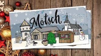 Das von der Bitburger Designerin Kerstin Stedem-Braun gestaltete Mötscher Wintermotiv gibt es auch als Weihnachtskarte. Der 5er Pack inkl. Umschläge kostet 8 Euro, erhältlich im Jedermanns. Zudem werden in den kommenden Tagen Mötscher Kinder diese im Dorf verkaufen. Der Erlös dient der Finanzierung des Eigenanteils für das Mötscher Kleinspielfeld, welches im Zuge des Aktiv-Parkes im kommenden Jahr auf dem Sportplatz-Gelände errichtet wird.