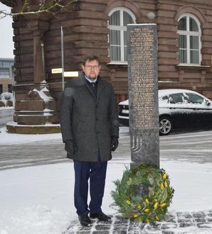 Um an diesem besonderen Tag ein Zeichen gegen Diskriminierung, Rassismus und Fremdenfeindlichkeit zu setzen, legte Bürgermeister Joachim Kandels am 27. Januar 2023 an der Gedenkstele für die jüdische Gemeinde Bitburgs am Markt einen Kranz nieder.