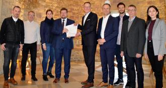 Im Beisein von MdL Nico Steinbach (4.v.r.) überreichte Innenminister Michael Ebling (Bildmitte) die Förderbescheide an Bürgermeister Joachim Kandels (4.v.l.).