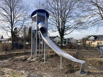 Der brandneue Rutschenturm auf dem Spielplatz Mozartstraße wurde dieser Tage geliefert und aufgestellt. Ende Februar werden die Nebenarbeiten abgeschlossen sein und das neue Spielgerät kann genutzt werden.