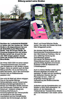 Dem wirkt die Stadt seit Jahren entgegen. Zug um Zug werden Bitburgs Gemeindestraßen saniert. Zurzeit laufen Straßenunterhaltungsmaßnahmen im Bereich der Prälat-Benz-Straße zwischen den Eimündungen Festplatz und „An der Südschule“. Zusätzlich erfolgt eine Knotenpunktanhebung im Einmündungsbereich der Thilmanystraße mit Anschluss an den Kirchweg. Anschließend wird die Fahrbahndecke zwischen den Einmündungen „Auf dem Stock“ und Kreisel Mötscher Straße saniert. Hier sollen die Arbeiten bis Ende März fertiggestellt werden.