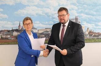 Geschäftsführerin Martina Drolshagen und Bürgermeister Joachim Kandels nach der Vertragsunterzeichnung im Rathaus