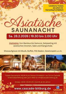 Wichtige Informationen im Überblick: Die Veranstaltung findet von 19:30 Uhr bis 2:00 Uhr statt. Letzter Einlass 23:00 Uhr. (Einlass ab 18 Jahren). Der reguläre Saunabetrieb endet an diesem Tag bereits um 18:00 Uhr. Tickets sind ab sofort direkt vor Ort oder per E-Mail unter info@cascade-bitburg.de erhältlich. Da das Kontingent begrenzt ist, empfiehlt sich ein frühzeitiger Ticketkauf.