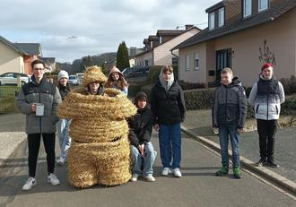 Der diesjährige Jahrgang (vlnr): Elias Tölkes, Fabienne Fröde, Noah Müller (im Strohbär), Chiara Gansen, Maximilian Hamper, Timon Schneider, Alexander Thielen und Pierre Neuhaus