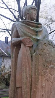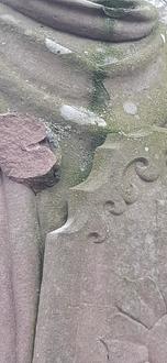 An unserem Donatusbrunnen wurde die rechte Hand der Sandsteinskulptur abgeschlagen, und das Metallsymbol (ein Blitz) entfernt.