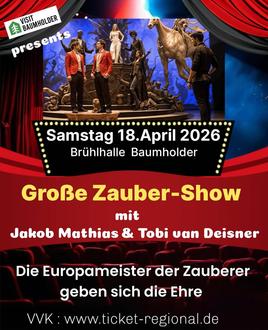 Am Samstag, den 18.04.2026, verwandelt sich die Brühlhalle Baumholder in eine Bühne voller Magie, Humor und spektakulärer Unterhaltung. Unter dem Titel „Große Zauber- und Comedyshow Baumholder“ erwartet das Publikum ein außergewöhnlicher Showabend, der Staunen und Lachen auf einzigartige Weise verbindet. Einlass ist ab 19:00 Uhr, Beginn der Show um 20:00 Uhr.