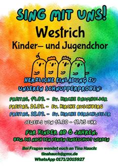 Herzliche Einladung zu den Schnupperproben des Westrich-Kinder- und Jugendchors, die an drei Freitagen im März jeweils von 16.30 bis 17:45 Uhr an drei unterschiedlichen Standorten in der Verbandsgemeinde Baumholder stattfinden werden. Los geht’s am 14.03. in der Ev. Kirche Baumholder. Am 21.03. können interessierte Kinder ab 6 Jahren in der Ev. Kirche in Ruschberg in die Chorprobe reinschnuppern. Der letzte Schnuppertermin findet am 28.03. in der Ev. Kirche in Berschweiler statt.