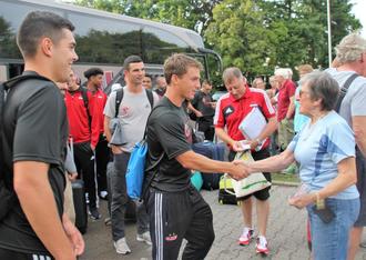 Elfriede Gedratis, seit 1990 immer dabei als Gastfamilie, begrüßt die ihr zugeteilten Studenten bei der Ankunft am Sportheim des VfR Baumholder