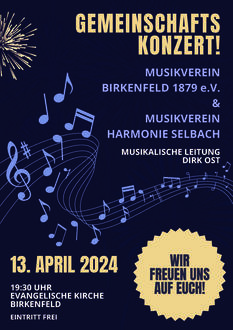 Am Samstag, 13.04.2024 laden der Musikverein Birkenfeld und der Musikverein Selbach zu der Neuauflage dieses Jubiläumskonzertes um 19:30 Uhr in die ev. Kirche in Birkenfeld ein.