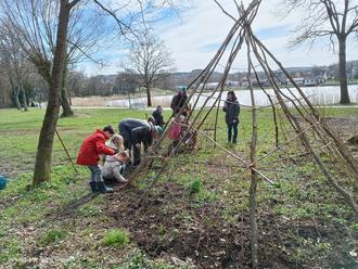 Ende März dann kamen acht Kinder der Klassen 1a und 1b mit der Lehrerin Frau Poizeaux zum Tipi am Weihergelände zu ihrem ersten Hilfseinsatz. Bevor die Kleinen mit viel Eifer an die “Arbeit“ gingen, erläuterte Dieter Nüssler die Bedeutung des Weidentipis und zeigte ihnen Beispiele von kunstvoll gebauten Vogelnester.