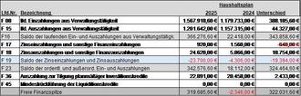 Aus der Planung ergibt sich im Finanzhaushalt für das Jahr 2027 einen Überschuss i.H.v. 1.654.097 € und im Jahr 2028 einen Überschuss i.H.v. 437.287 €.