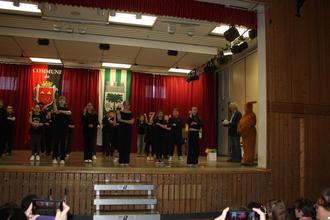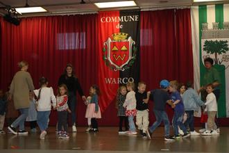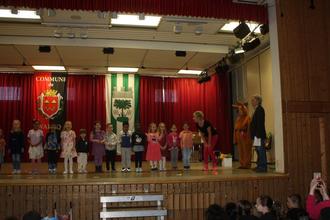 Vor der Besprechung im Stadthaus fand natürlich die Hauptveranstaltung in der Brühlhalle statt. Trotz des Ferienbeginns waren mehr als hundert Kinder mit Eltern und Großeltern erschienen. Kinder der Kindergärten und der Grundschule Westrich hatten mit ihren Erzieherinnen und ihren Lehrerinnen bzw. Lehrern Lieder und Tänze eingeübt, die sie auf der Bühne der Besucherschar darboten. Die Gelegenheit, vor einem großen Publikum auftreten und ihr tänzerisches Können zeigen zu können, nahmen viele Kinder mit Begeisterung wahr. Die Bürgermeisterin von Warcq, Frau Pierquin, und Stadtbürgermeister Günther Jung bedankten sich bei den Kindern, vor allem auch für die selbst gebastelten, kleinen Geschenke, die ihnen überreicht worden waren. Helmut Schmid, der als Conférencier des Morgens aufgetreten war, ließ die Kinder nach dem Osterhasen rufen und sorgte für einen sicheren Ablauf der Veranstaltung. Nach dem Mittagessen im Gasthaus „Zum Stern“ trafen sich dann später am Nachmittag die beiden Bürgermeister und die Mitglieder der Komitees bei Kaffee und Kuchen zu einem gemütlichen Beisammensein.