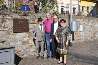 v.l.n.r.: Jürgen Henze (Vors. Komitee Baumholder), Bernard Maillard (Vors. Komitee Warcq), Günther Jung (Stadtbürgermeister Baumholder), Marie-Annick Pierquin (Bürgermeisterin Warcq)