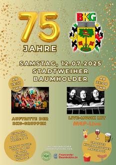 Die Baumholderer Karnevalsgesellschaft (BKG) feiert in diesem Jahr ihr 75-jähriges Bestehen – und lädt am 12.07.2025 zu einer großen Jubiläumsparty am Stadtweiher Baumholder ein. Ab 19:11 Uhr erwartet die Gäste ein buntes Programm mit Tanz, Musik und kulinarischen Genüssen.