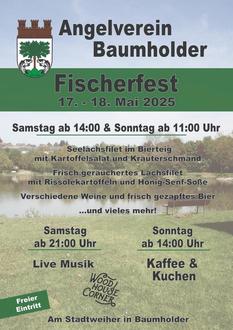 Der Angelverein Baumholder lädt am 17. und 18. Mai zum Fischerfest am Baumholderer Weiher. Angeboten werden Speisen wie Seelachs im Bierteig sowie weitere Fisch- und Grillspezialitäten. Für gezapftes Bier, verschiedene Weine und kalte Softdrinks wird ebenfalls gesorgt. Wir freuen uns auf Ihren Besuch!