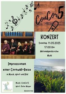 Zu einer besonderen musikalischen Reise lädt die Gruppe ConCor5 am Muttertag, 11.05.2025, in die Nationalparkkirche ein. Die fünf Musikerinnen und Musiker präsentieren Impressionen einer Cornwall-Reise in Musik, Wort und Bild. Beginn ist um 17:00 Uhr, der Eintritt ist frei. Im Anschluss besteht die Möglichkeit, im Festzelt auf der „Muhler Kirmes“ einzukehren.