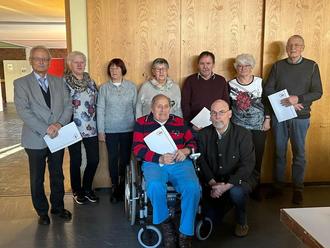 Ehrungen bei der AWO: v.l.n.r. Jürgen Henze, Angelika Dziwis, Ursula Döl, Brigitte Drobek, Michael Ingledue, Gerdi Peeß, Dieter Nüssler, Volkmar Pees (vorn) und AWO Ortsvereinsvorsitzender Klaus Dessauer